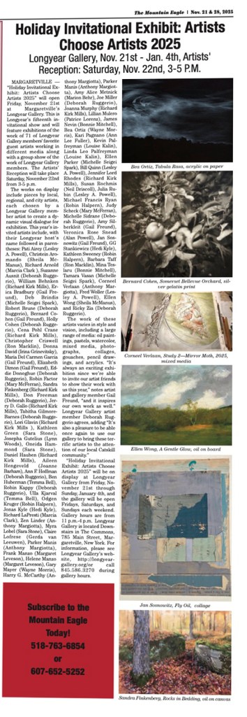 Longyear Gallery of Margaretville is pleased to announce the opening of “Members’ Winter Group Exhibition.” Opening on Friday, January 9th, this exhibition will run through Sunday, February 8th with the Opening Reception on Saturday, January 10th from 3-5 p.m.