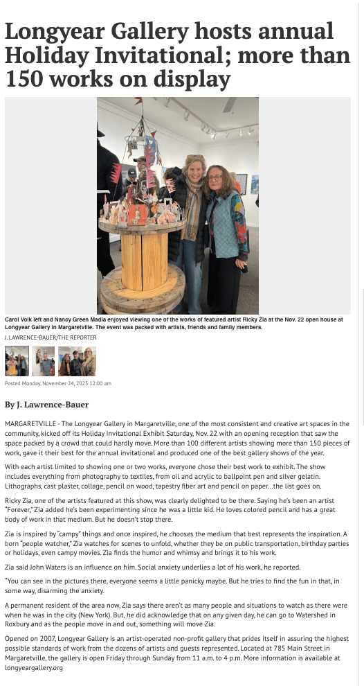 Future winter and early spring 2026 Longyear Gallery exhibits include “Members’ Late Winter Exhibit” accompanied by “Mary McFerran” New Member Introduction Exhibit” running from Friday, February 13th through Sunday, March 15th with the opening reception on Saturday, February 14th from 3-5 p.m. Opening on Friday, March 20th and running through Sunday, April 19th, with the opening reception on Saturday, March 21st from 3-5 pm, will be a Special Exhibition: “DRAWING – Take a Line for a Walk,” accompanied by a Members Group Show of Longyear members who are not participating in the Special Exhibition.