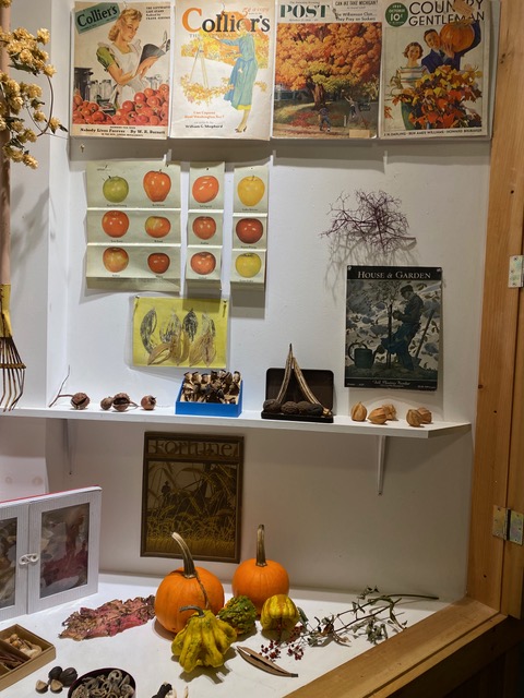 Four years ago, Longyear Gallery member Hedi Kyle had an idea: why not transform the cabinet of shelves in the hallway just outside the gallery entrance into a miniature gallery of sorts, displaying objects and artworks related to a specific theme. After she brainstormed the idea with fellow gallery member Elaine Grandy, the “Cabinet of Curiosities” was born, and ever since the mini-exhibitions of ephemera, small paintings and drawings, charts, vintage advertisements, and objects ranging from stones and seeds to cleaning supplies and rubber duckies to iron tools, has been fascinating visitors on their way in or out of the gallery.