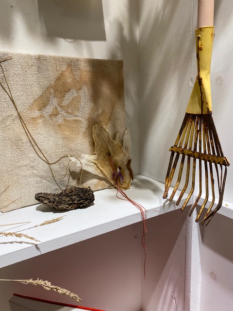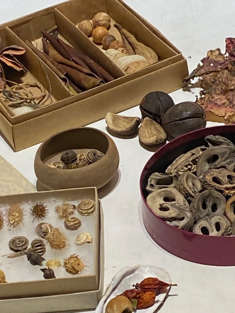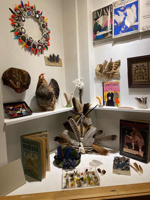 Since Elaine’s passing, gallery member Louise Kalin has been working with Hedi on the displays, which involve coming up with a theme and collecting items, many of which are contributed by members. “We email the members to put anything that goes with the themes in our cubby holes, and then we put it all together and make sense of it,” says Hedi; arranging the display takes four to five hours. The exhibits are changed out every two months, and the themes have included fish, stones, sticks, toys, paper, tools, lists and even cleaning equipment. “With each theme, you start looking at things differently and discover new associations,” Hedi says. Seeing the sculptural qualities of a sponge, rake or mushroom, for example, the rhythmic interest of a row of chisels, the rich variety of colors and textures in a box of feathers, is part of the fun. Adding graphic interest are the magazine covers, pages, and ads contributed by Hedi’s husband, Juergen Menningen, from his extensive archive of old magazines.