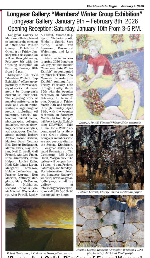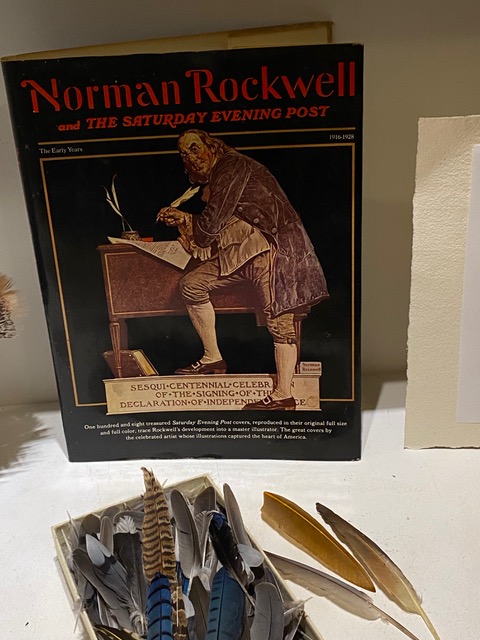 Louise says that each mini-exhibition has a “lovely underpinning of poetic structure,” which in the case of the Feathers exhibit, was organized around a literal poem, Emily Dickinson’s ““Hope” is the thing with feathers.” She describes the display as “an enormous collage.” The theme of the current exhibit is Notebooks, which makes for a particularly rich exploration of the ideas of notation, physical books, sketchpads, diaries, scrapbooks, even a stitched book, in the case of an item donated by Longyear member Gail Freund. So next time you’ve stepped into the hall, be sure to take a look; it will be well rewarded. The cabinet is “always lit,” notes Hedi, and if you want to take a closer look, make an appointment with her and she’ll open the cabinet at your request.